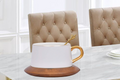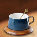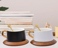 Izanstore presenting you Nordic Fancy Matte Ceramic Cup With Gold Coated Spoon & Wooden Saucer made up of pure ceramic value added by Arrow like gold color coated spoon and luxurious design that you can use for coffee, tea or any other drink for your distinguished guest.