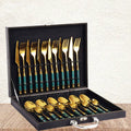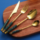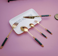 Izanstore is presenting you 24 Pcs Luxury Modern Set- Gold & Green Marblene Cutlery. This modern Cutlery set at the table is the first item that meets the diners’ eyes. Proportion, balance, and craftsmanship are the criteria of a quality Cutlery set, made of pure stainless steel.