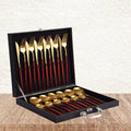 Izanstore is presenting you 24 Pcs Luxury Modern Set- Gold & Red Cutlery. This modern Cutlery set at the table is the first item that meets the diners’ eyes. Proportion, balance, and craftsmanship are the criteria of a quality Cutlery set, made of pure stainless steel.
